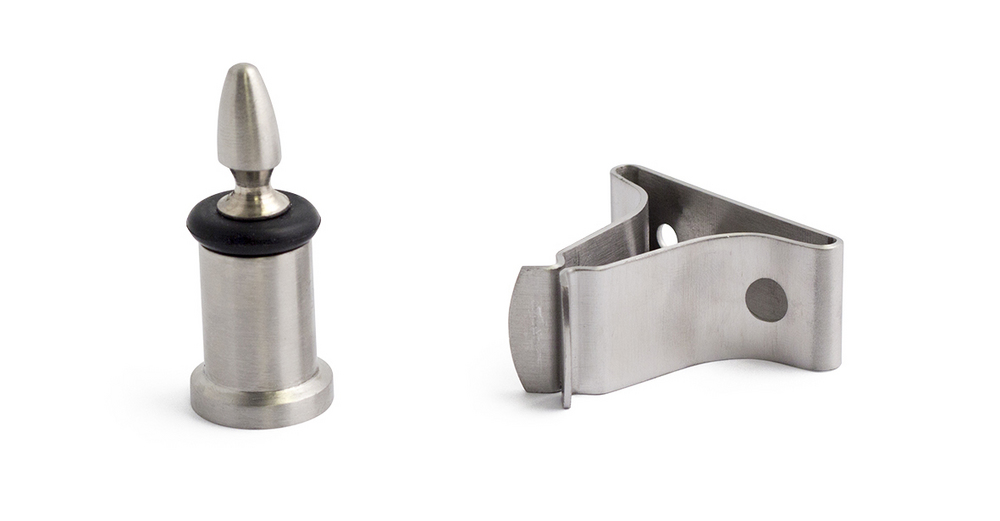 Dørholder av rustfritt stål med fjærende sluttstykker og skjult innfesting av veggdelen. Inkludert skruer.