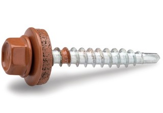 Borrende og gjengestampende skrue for utvendig montering av byggplater, lakkert i samme farge som byggplaten.