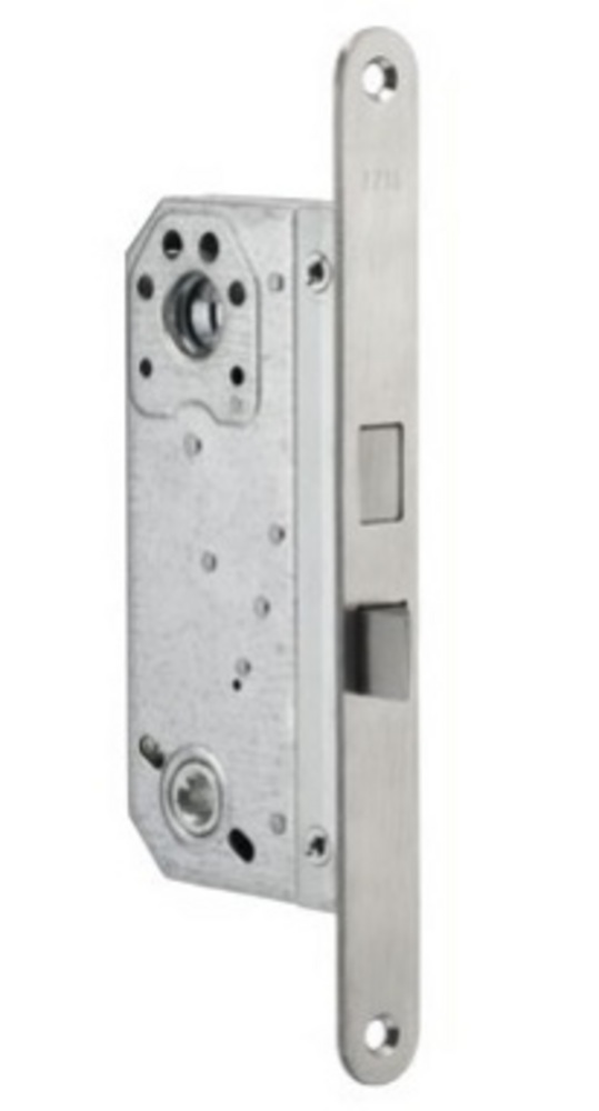 Reilelåskasse med falle for dørvrider og sylinderfunksjon. Rustfritt stål i stolpe, reile og falle. Vendbar vriderfalle for