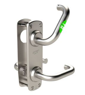 Beslagets innside: Nødrømning skjer fra innsiden med ett grep ved å benyttes det godkjente nødutgangsbeslaget som er plassert der låssylinder normalt er montert. Den nedre vrideren betjener kun vriderfallen.